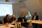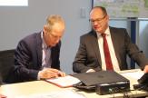 Lübbeckes Bürgermeister Frank Haberbosch (2.v.l.) setzt seine Unterschrift unter die Entwicklungsvereinbarung zwischen der Stadt Lübbecke und der Hanseatischen Betreuungs- und Beteiligungsgesellschaft (HBB), mit der das Vorhaben "Westertor" realisiert werden soll. Er ist von der jetzt auf dem Tisch liegenden vorläufigen Planung genau so überzeugt wie Baudezernent Ingo Ellerkamp (links), der leitende HBB-Projektentwickler Reinhard Mussehl (2.v.r.) und Architekt Jens Thormeyer (rechts).