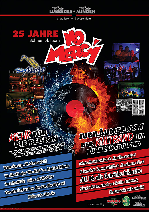 Seit nunmehr 25 Jahren steht die Kultband "No Mercy" auf der Bühne. Das "Blue Mojo" in Lübbecke wird seit 2005 von Andy Bautz betrieben. Seit drei Jahren gibt es das Internetportal HALLO LÜBBECKE, welches seit einigen Wochen attraktiven Nachwuchs bekommen hat: HALLO MINDEN. Das sind vier gute Gründe für eine ausgiebige Party, die am Samstag, 20. Okrober, ab 21 Uhr im Blue Mojo steigen wird.